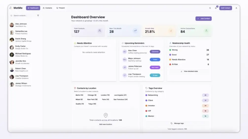 MetMe is built for the messy overlap of modern life β friends, investors, clients, and random barista intros. It works across all your worlds.